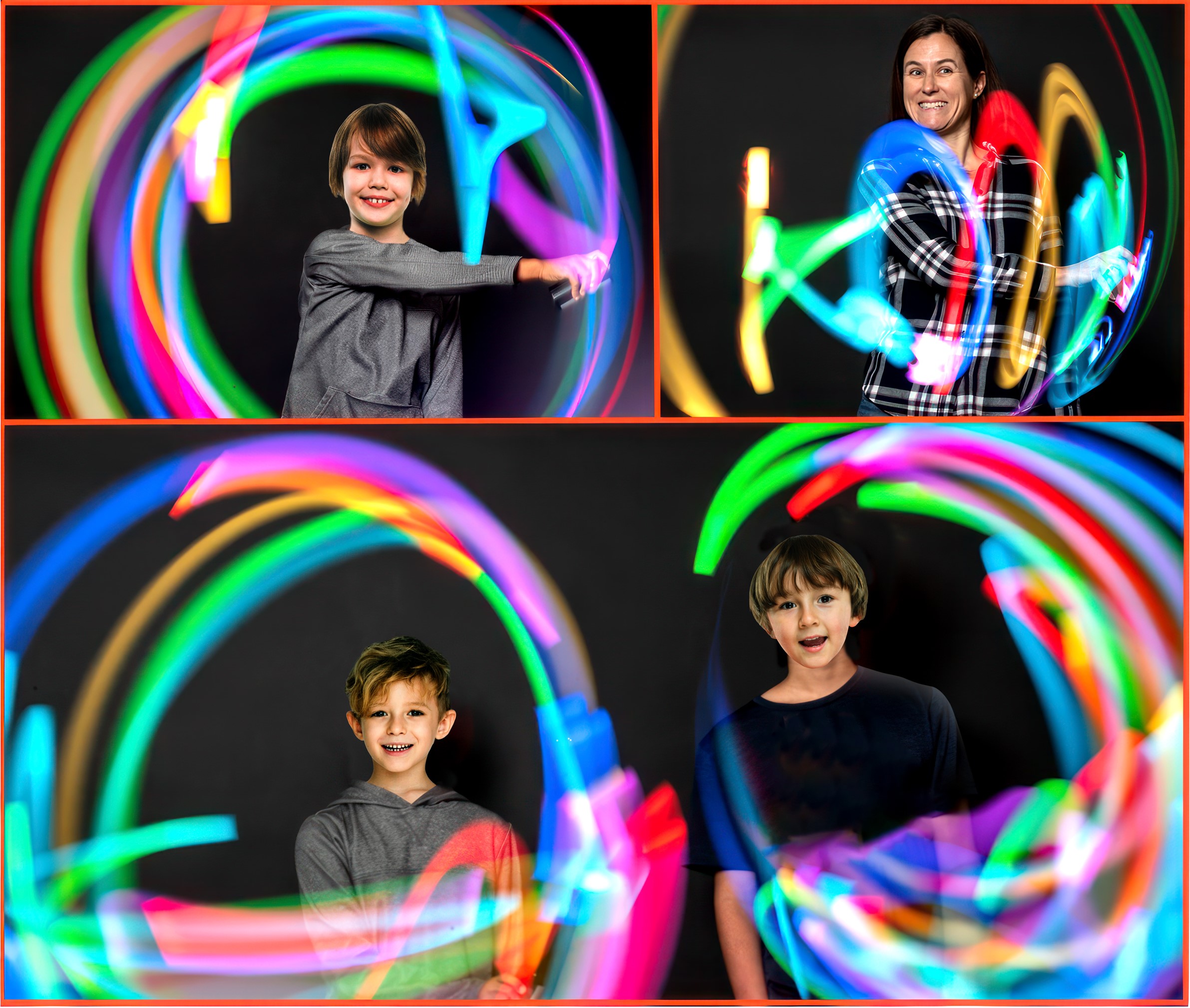 Hop into our darkened tent, grab your hand held LED light we provide and have a ball designing your very own colorful light design. After 2 or 3 practice sessions, we will record all your movements for about 20 seconds and wala, you've created a masterpiece! We'll make a 4x6 print on the spot for you and send the file to your phone while your are still at your event!!