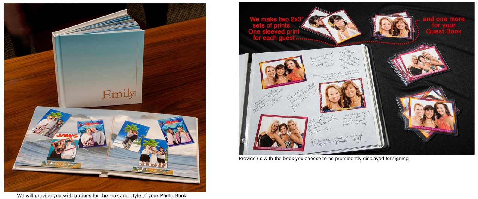 Honor your guests to be remembered and recall the fun and celebration by inviting them to add their photo and well wishes to your beautiful signed guest Book. We make two 3x4 prints: one for each guest in the photo and one for the book for you to keep.
